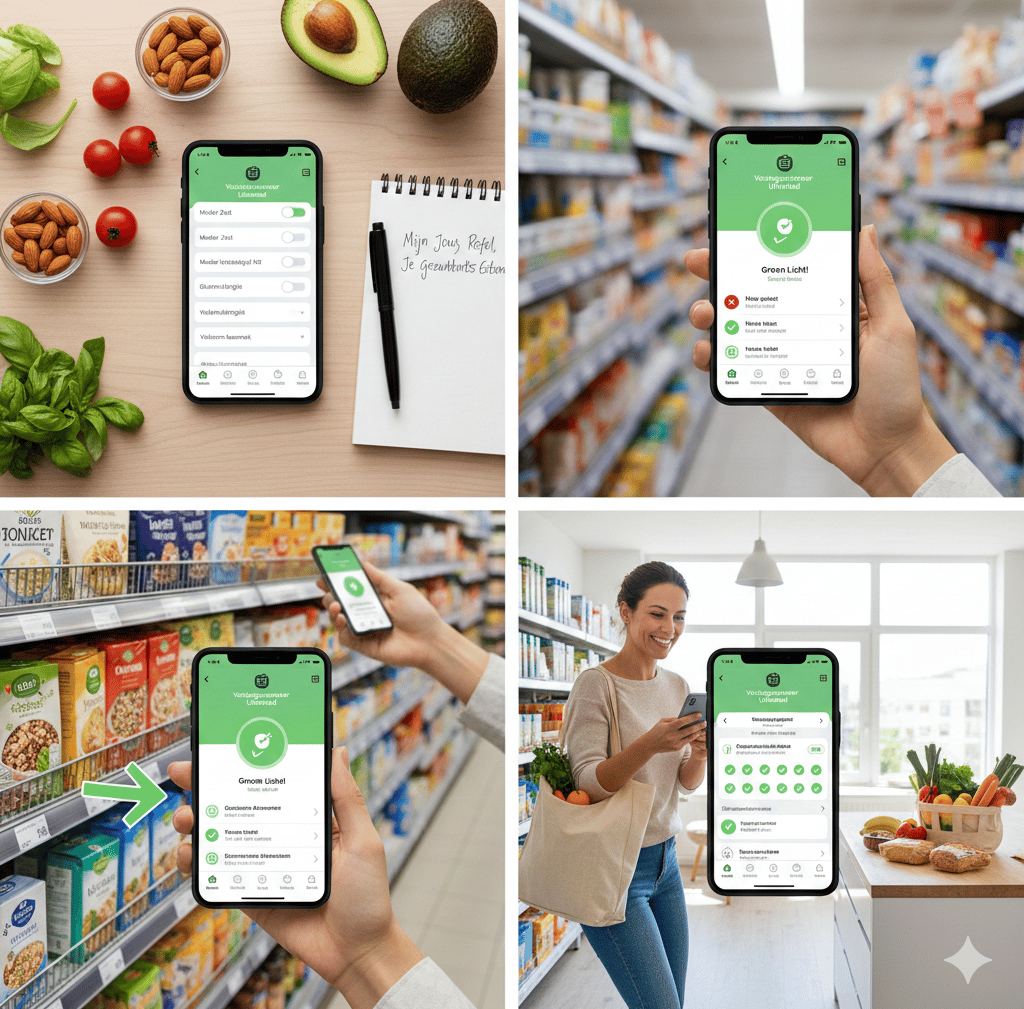 Je loopt langs het schap en twijfelt tussen twee soorten yoghurt. Je pakt de eerste, opent de app, en scant de barcode. Binnen een seconde zie je een duidelijk oordeel, gebaseerd op jouw persoonlijke doelen én de richtlijnen van de Schijf van Vijf.